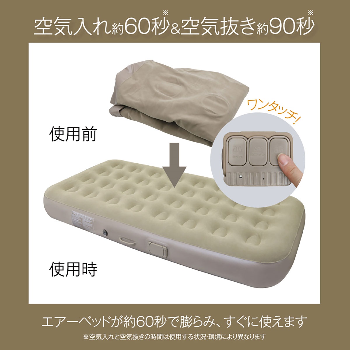 ワンタッチでエアーベッドが約60秒で膨らみ、すぐに使えます。