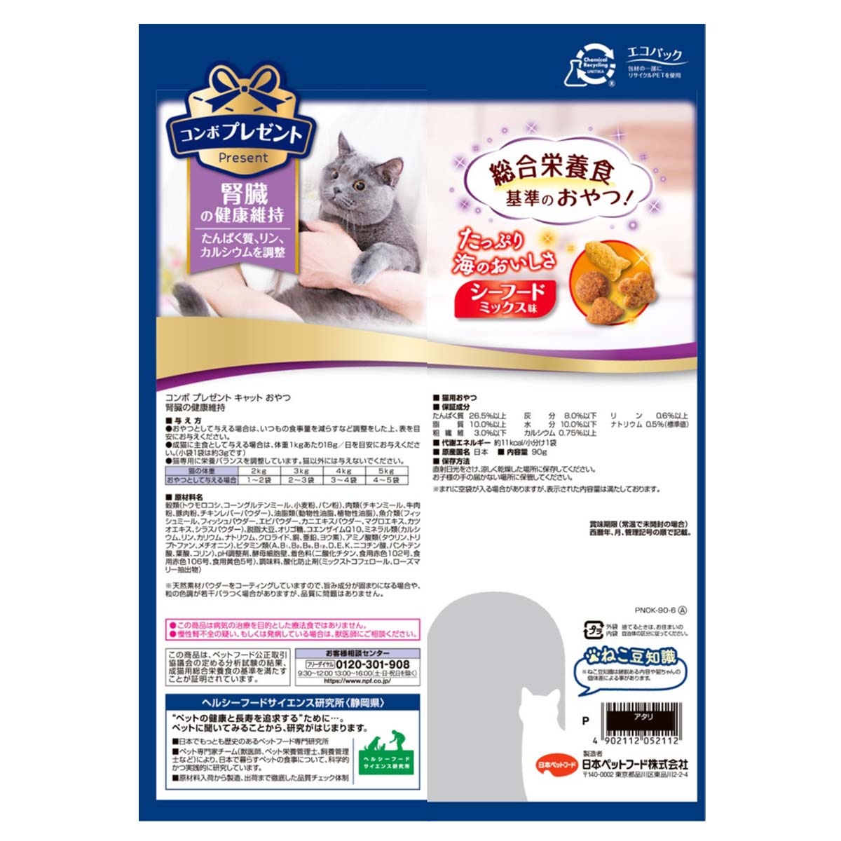 穀類(トウモロコシ、コーングルテンミール、小麦粉、パン粉)、肉類(チキンミール、牛肉粉、豚肉粉、チキンレバーパウダー)、油脂類(動物性油脂、植物性油脂)、魚介類(フィッシュミール、フィッシュパウダー、エビパウダー、カニエキスパウダー、マグロエキス、カツオエキス、シラスパウダー)、脱脂大豆、オリゴ糖、コエンザイムQ10、ミネラル類(カルシウム、リン、カリウム、ナトリウム、クロライド、銅、亜鉛、ヨウ素)、アミノ酸類(タウリン、トリプトファン、メチオニン)、ビタミン類(A、B1、B2、B6、B12、D、E、K、ニコチン酸、パントテン酸、葉酸、コリン)、pH調整剤、酵母細胞壁、着色料(二酸化チタン、食用赤色102号、食用赤色106号、食用黄色5号)、調味料、酸化防止剤(ミックストコフェロール、ローズマリー抽出物)