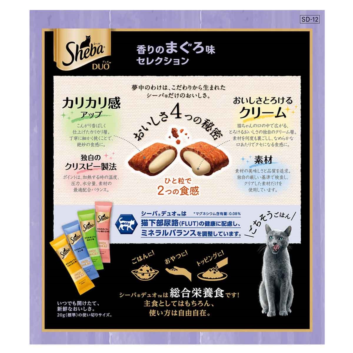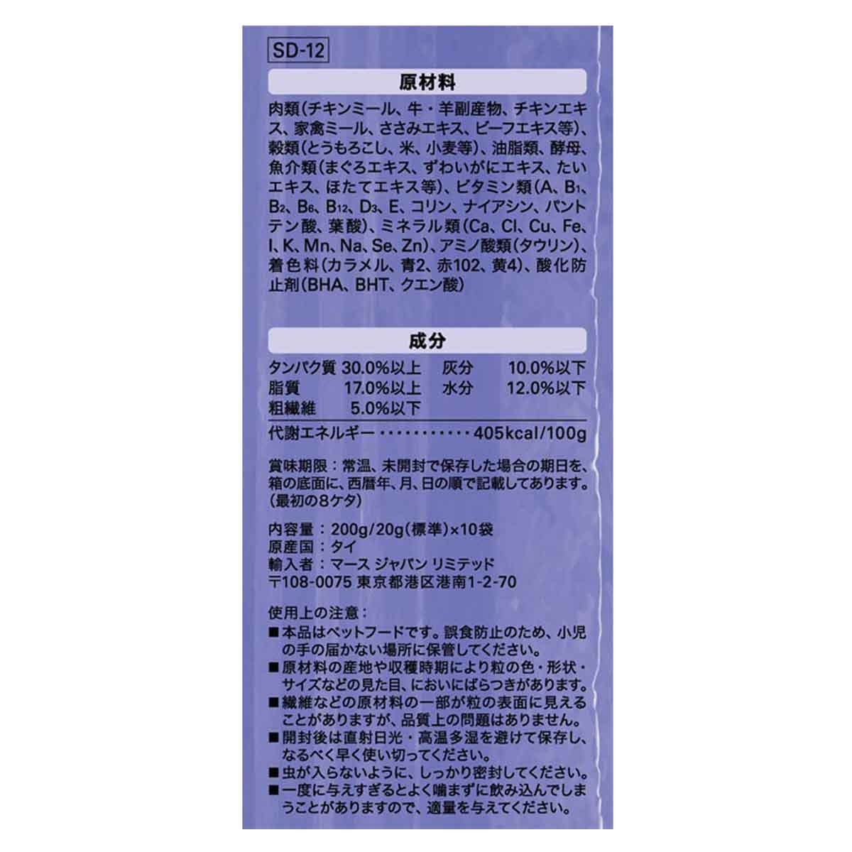 肉類(チキンミール、チキンエキス、家禽ミール、ささみエキス、ビーフエキス等)、穀類(とうもろこし、米、小麦等)、油脂類、酵母、魚介類(まぐろエキス、ほたてエキス、たいエキス、ずわいがにエキス等)、ビタミン類(A、B1、B2、B6、B12、C、D3、E、コリン、ナイアシン、パントテン酸、葉酸)、ミネラル類(Ca、Cl、Cu、Fe、I、K、Mg、Mn、Na、P、Se、Zn)、アミノ酸類(タウリン)、着色料(カラメル、青2、赤102、黄4)、酸化防止剤(BHA、BHT、クエン酸)