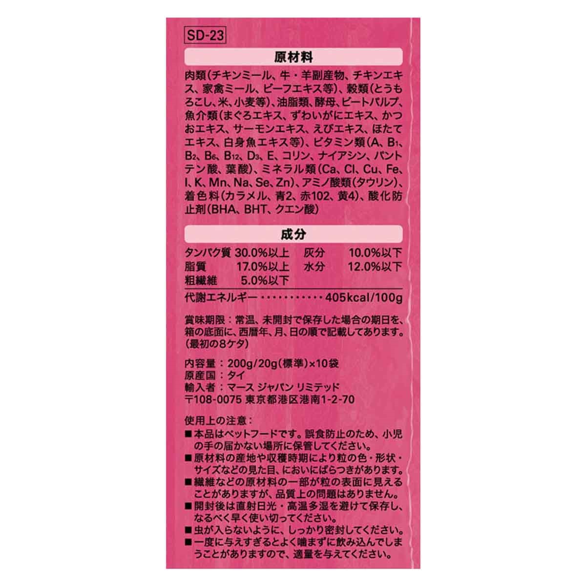 肉類(チキンミール、チキンエキス、家禽ミール、ささみエキス、ビーフエキス等)、穀類(とうもろこし、米、小麦等)、油脂類、酵母、ビートパルプ、魚介類(まぐろエキス、ほたてエキス、かつおエキス、サーモンエキス、えびエキス、白身魚エキス、ずわいがにエキス等)、ビタミン類(A、B1、B2、B6、B12、C、D3、E、コリン、ナイアシン、パントテン酸、葉酸)、ミネラル類(Ca、Cl、Cu、Fe、I、K、Mg、Mn、Na、P、Se、Zn)、アミノ酸類(タウリン)、着色料(カラメル、青2、赤102、黄4)、酸化防止剤(BHA、BHT、クエン酸)