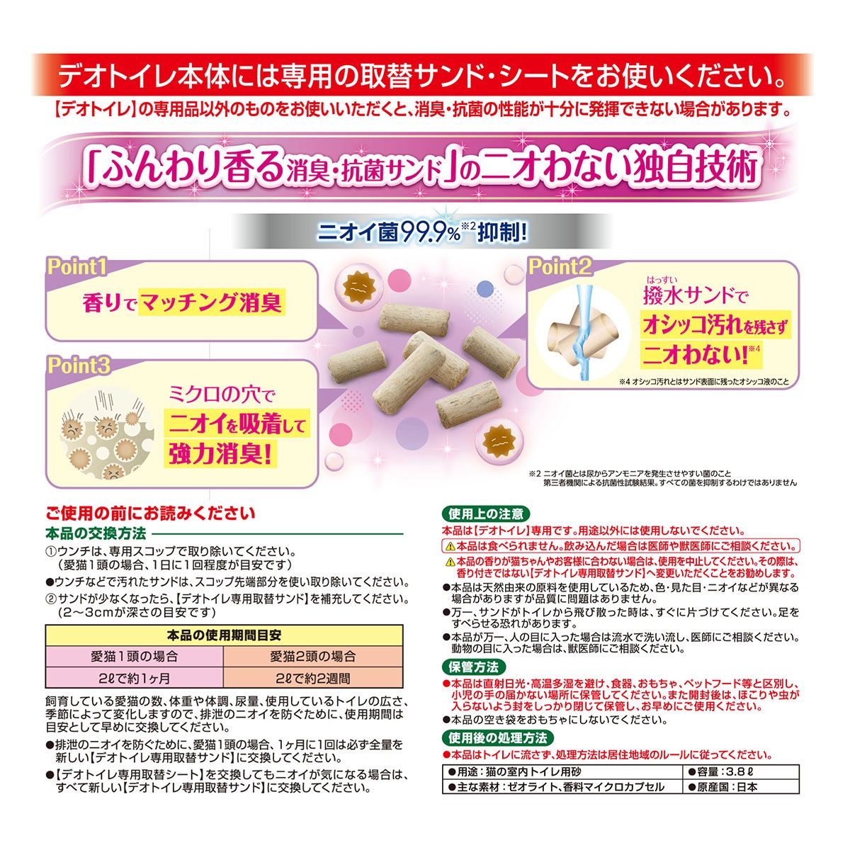 ミクロの穴でニオイを吸着して強力消臭し、砂かきするたびに香りのカプセルがはじけて香りが発生します。