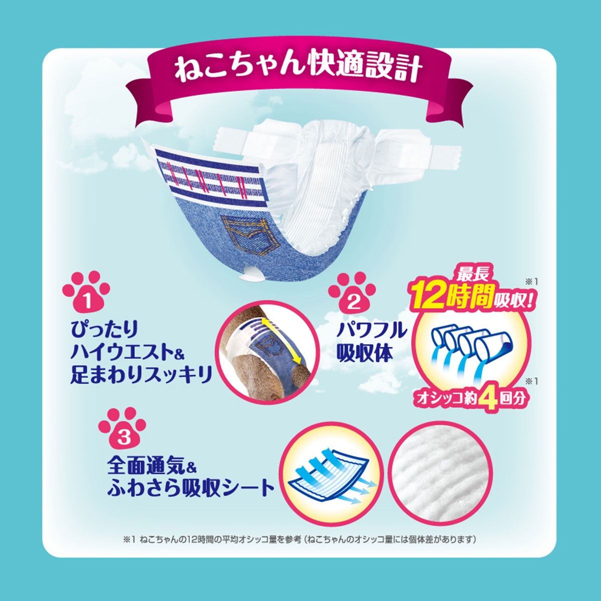 ぴったりハイウエスト&足まわりスッキリ、パワフル吸収体、全面通気&ふわさら吸収シートの快適設計!