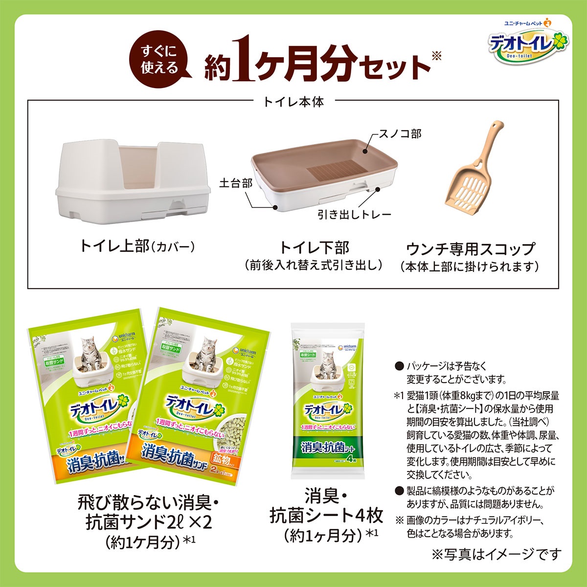 トイレ本体+飛び散らない消臭・抗菌サンド2L×2(約1ヶ月分)+消臭・抗菌シート4枚(約1週間分)+ウンチ専用スコップ