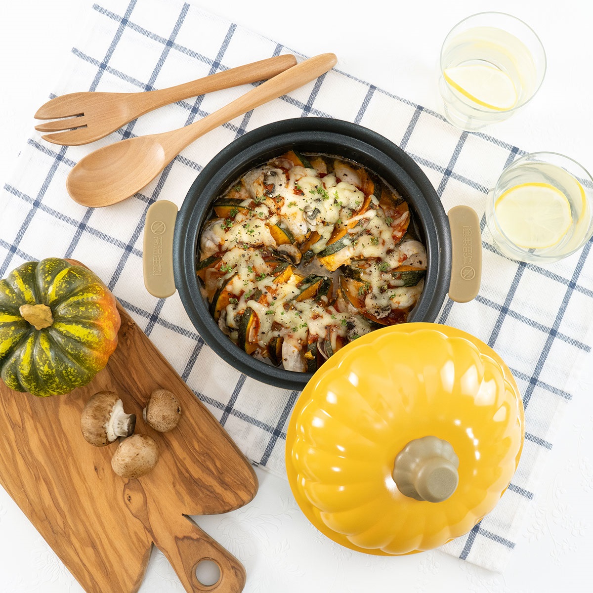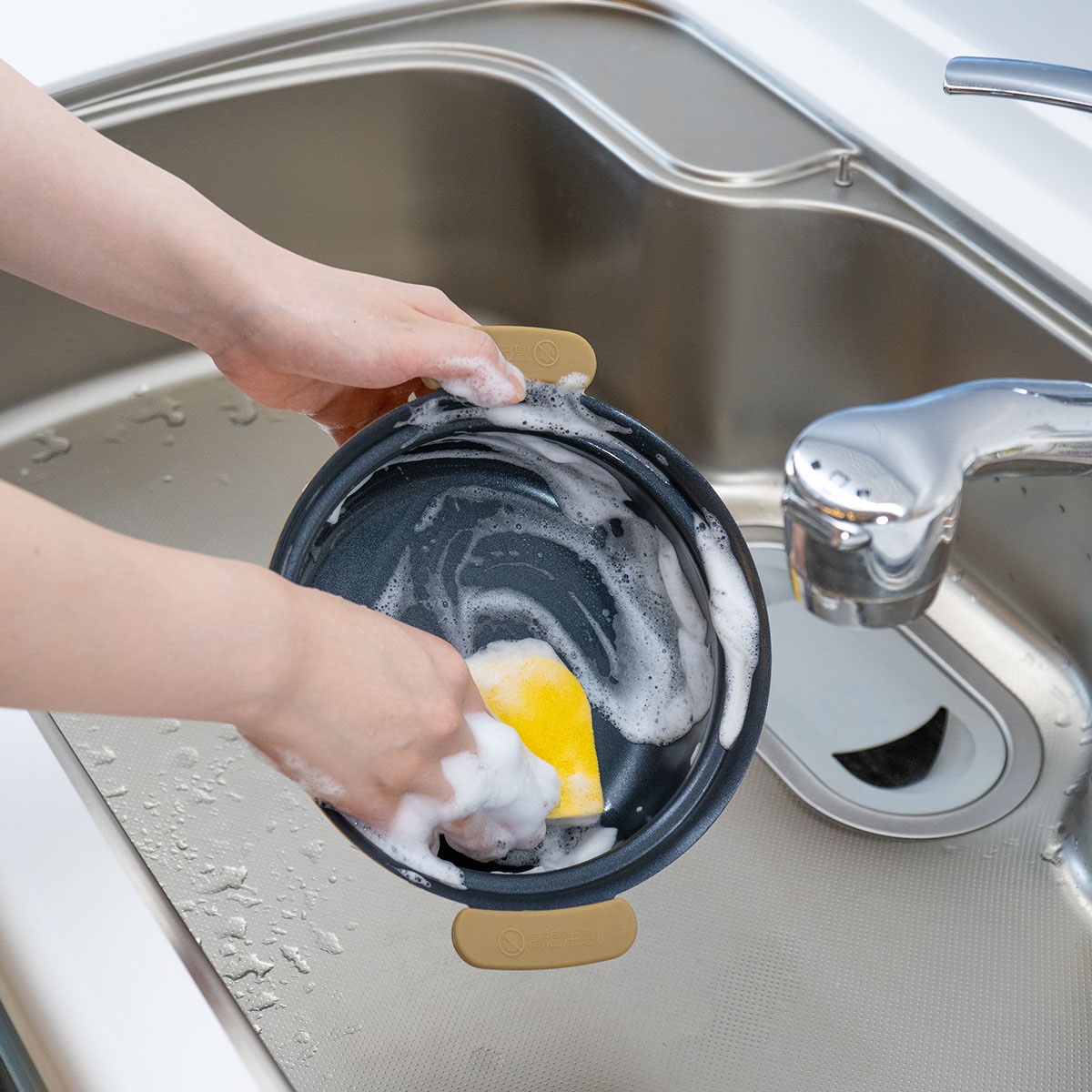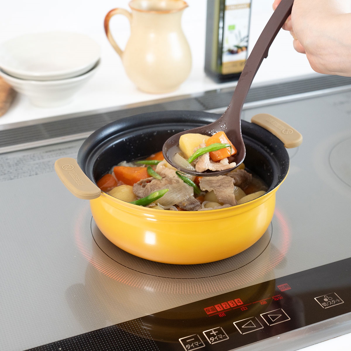 本体:アルミニウム合金、内面:ふっ素樹脂加工、外面:焼付塗装、はり底:ステンレス鋼、つまみ:フェノール樹脂、蓋:アルミニウム合金