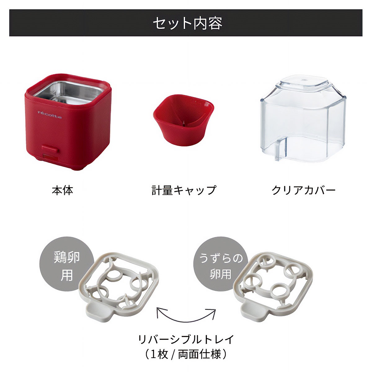 本体の水受けトレイに、計量キャップで水を入れ、穴あけピンで殻に穴をあけた卵をセットし、電源スイッチを入れるだけの簡単操作。