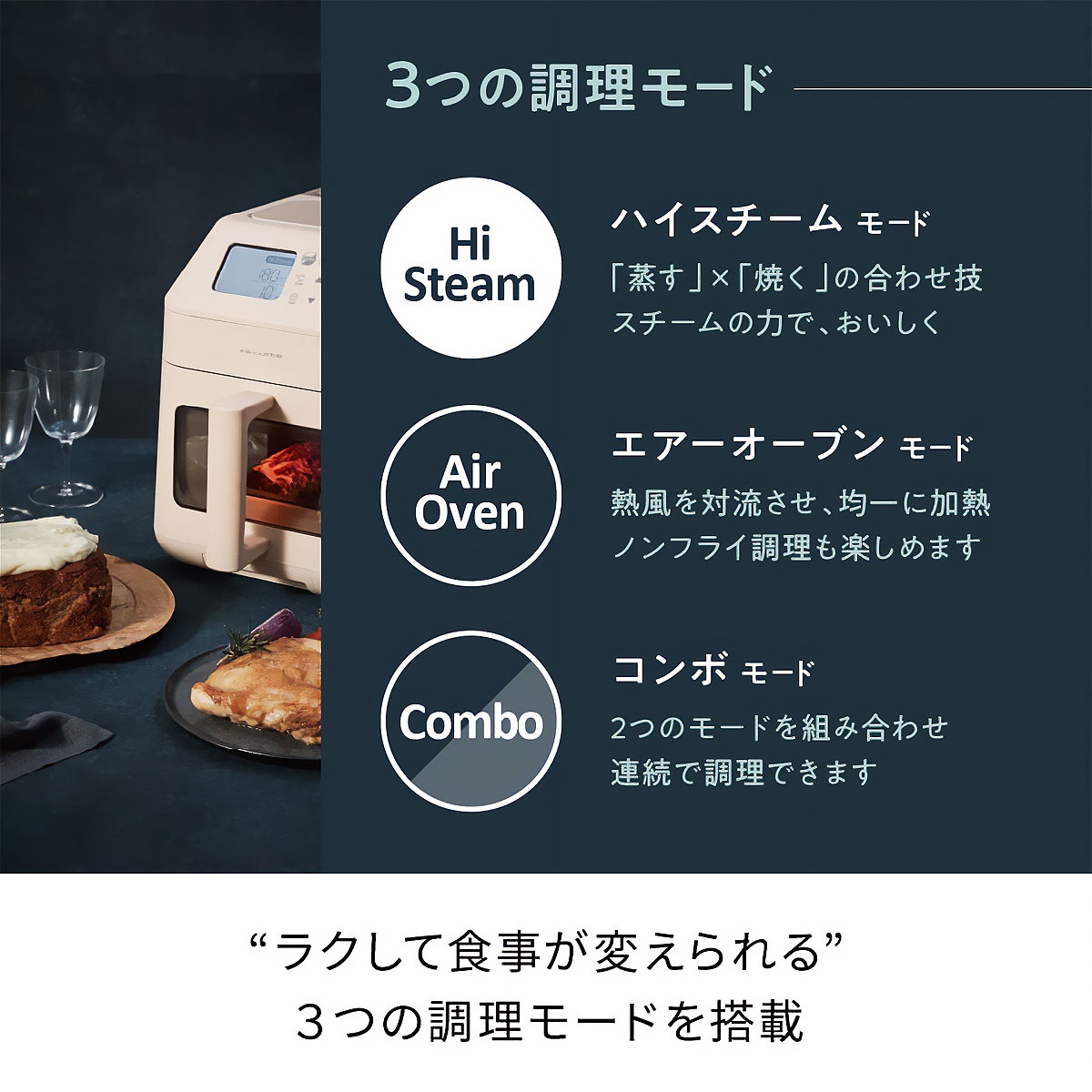 約100度の高温スチームとヒーター&ファンによる【熱風】の加熱を組み合わせることで、食材から潤いを逃さず、蒸しながら焼くというハイレベルな調理ができ、『焼く』・『蒸す』の2つの調理工程を1度に、そして難しい調理を機械におまかせできる調理家電となっております。