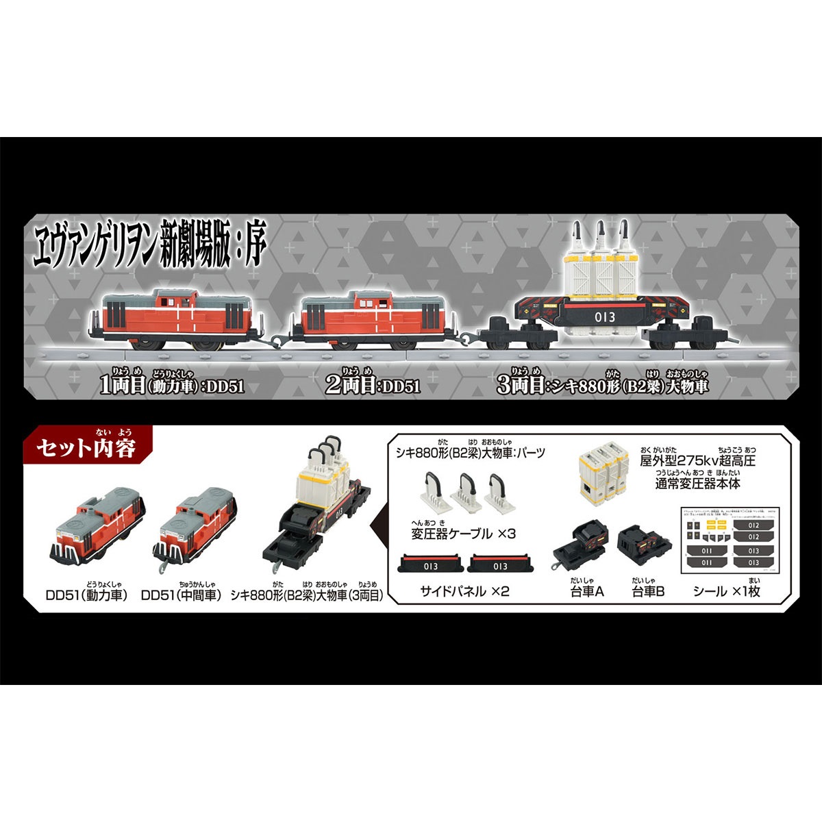 『ヱヴァンゲリヲン新劇場版:序』に登場し『ヤシマ作戦』にて活躍する車両がプラレールで登場です。 DD51形と、シキ880形(B2梁)大物車に屋外型275Kv超高圧通常変圧器を積載しています。