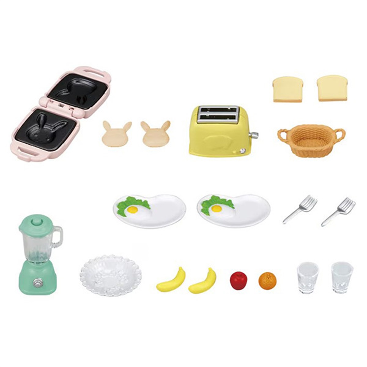 トースター、ホットサンドメーカー、ミキサー本体、カップ、フタ、モーニングプレート×2、皿、バスケット、フォーク×2、コップ×2、食パン×2、ホットサンド×2、バナナ×2、リンゴ、オレンジ
