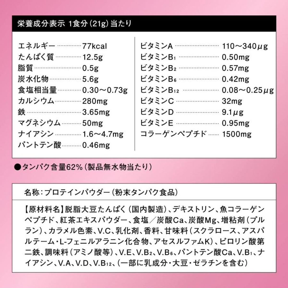 脱脂大豆たんぱく(国内製造)、デキストリン、魚コラーゲンペプチド、紅茶エキスパウダー、食塩/炭酸Ca、炭酸Mg、増粘剤(プルラン)、カラメル色素、V.C、乳化剤、香料、甘味料(スクラロース、アスパルテーム・L-フェニルアラニン化合物、アセスルファムK)、ピロリン酸第二鉄、調味料(アミノ酸等)、V.E、V.B2、V.B6、パントテン酸Ca、V.B1、ナイアシン、V.A、V.D、V.B12、(一部に乳成分・大豆・ゼラチンを含む)