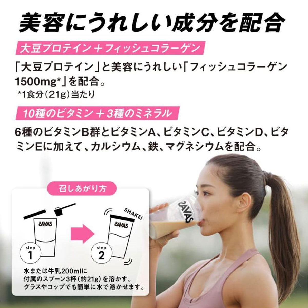 引き締まったカラダづくりをサポートする『大豆プロテイン』と美容にうれしい『フィッシュコラーゲン1500mg※』を配合しているので、健康的なキレイを目指すことができます。『10種のビタミンと3種のミネラル』配合。