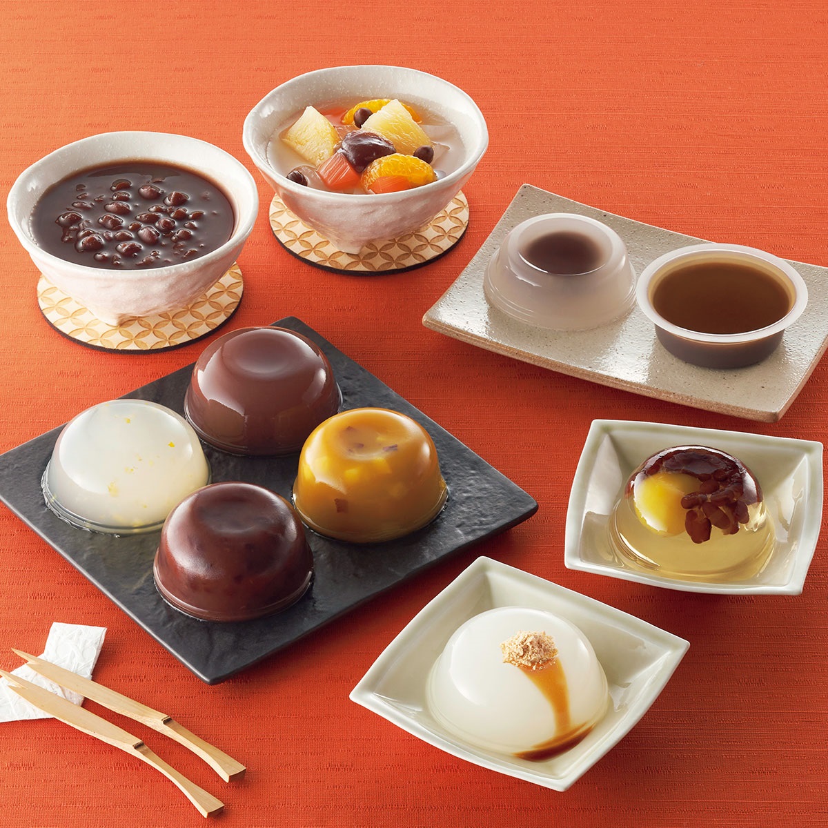 栗かのこ くずもち(黒みつ きな粉付) くずまんじゅう×各1コ、きんつばようかん 芋ようかん 柚子くずもち ぜんざい あんみつ 黒糖ようかん×各2コ、あずきとうふ×3コ