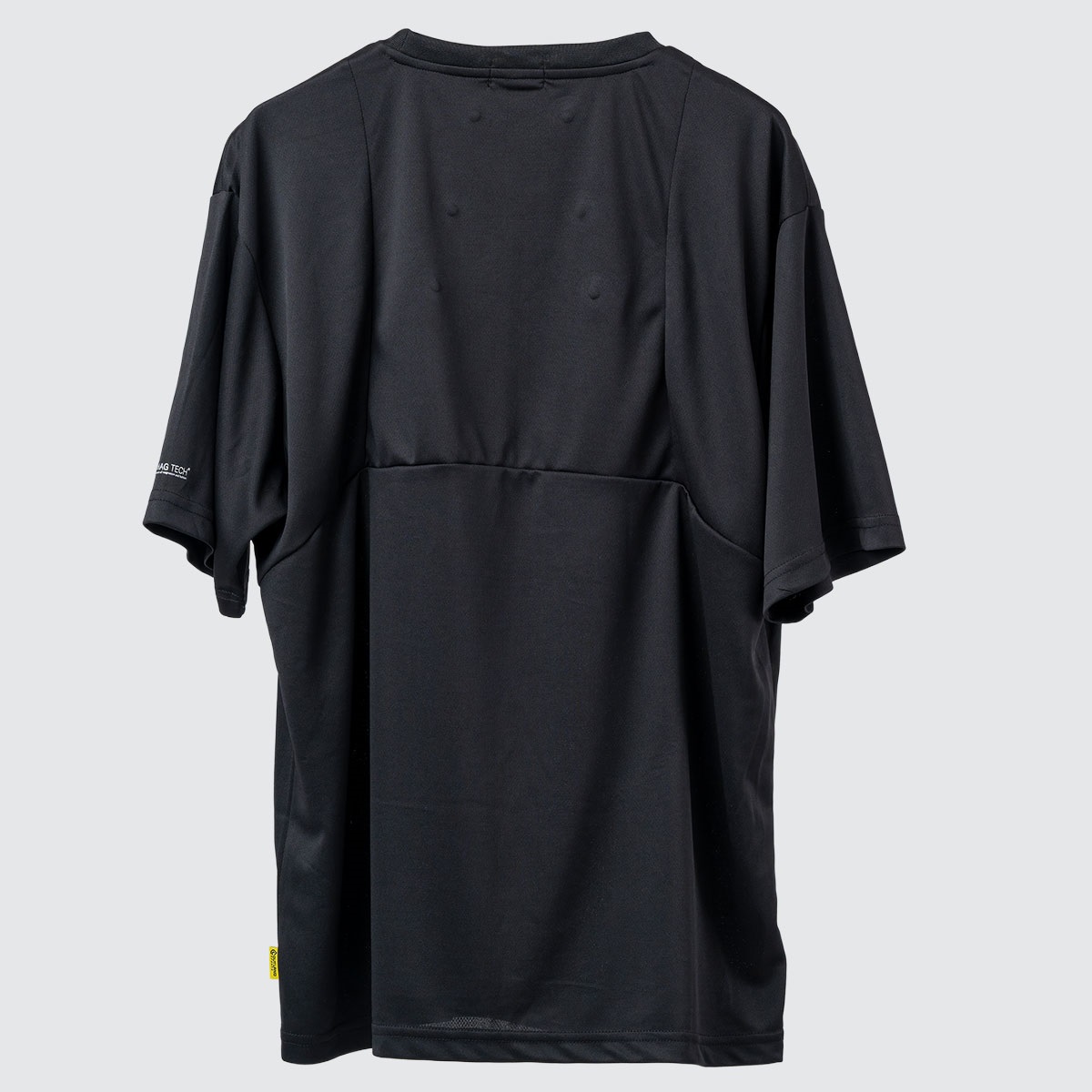 永久磁石100mt×6箇所を肩甲骨に沿って配置したクラス2の管理医療機器ウェア。肩・背中のコリに効き、血行改善する磁気治療器。背中部分の特殊切替『シャドーシステム』により磁石を見えにくくし、外着など幅広いシーンで活用可能。濡れても安心、繰り返し洗濯も可能。胸ロゴプリントがさりげなくかわいい。黄色ピスネームがアクセントになっている。