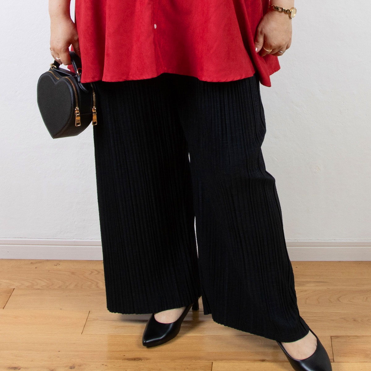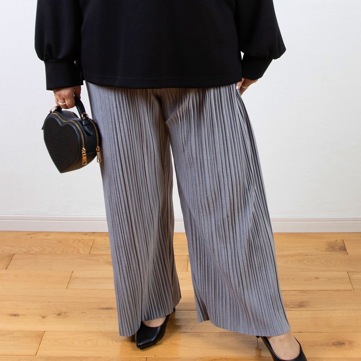 人気インフルエンサー【ぽっちゃりけいこ】コラボ、秋の着やせコーデ! ①華やかなベロア素材のボトム プリーツ加工を施しており豪華さを増します ②脚長効果のあるワイドパンツ ③股ぐり深め設定で、穿きやすく安心