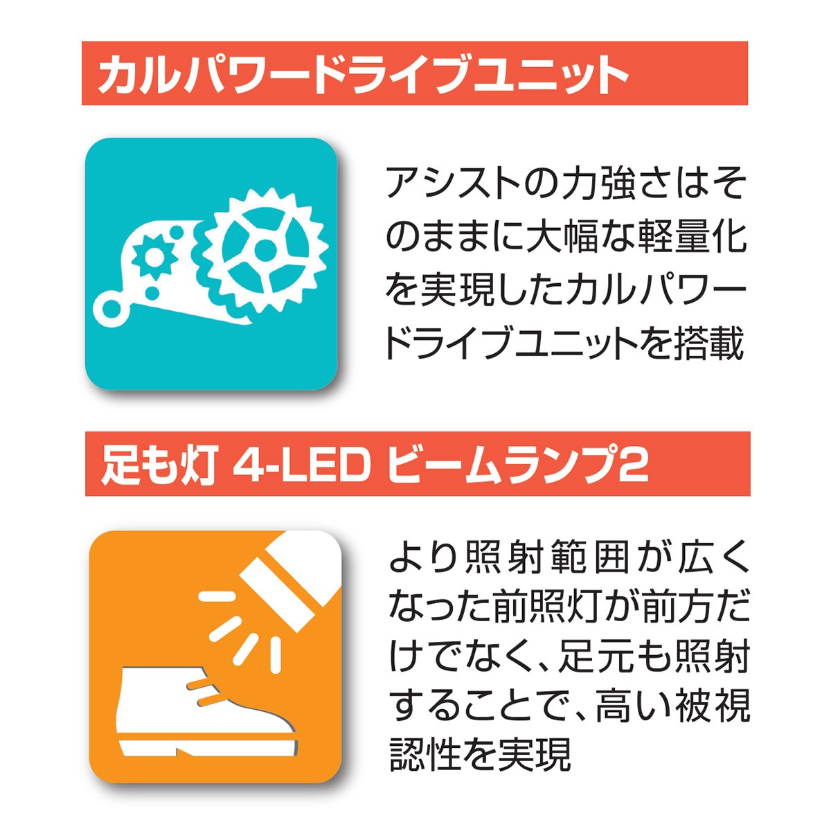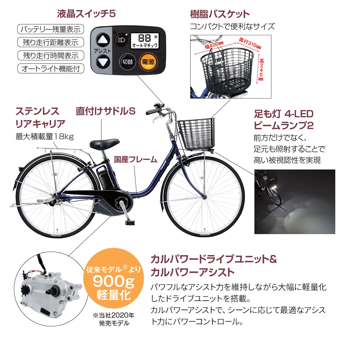 機能を厳選した実用的なお買い得モデル。シーンに応じて最適アシスト「カルパワードライブユニット」、バッテリー残量表示・残り走行時間表示・残り走行距離表示・オートライト機能付「液晶スイッチ5」。