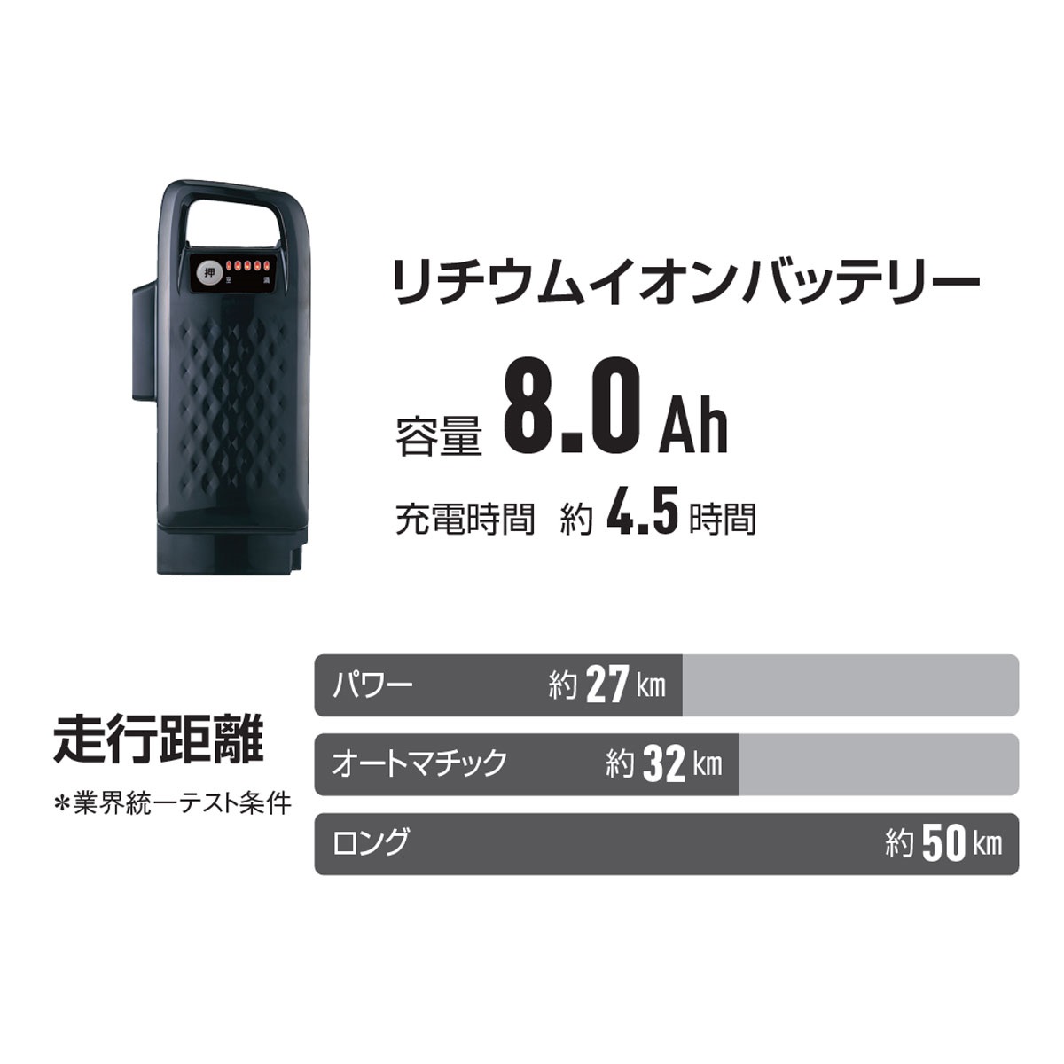 走行距離:ロング約50km・オートマチック約32km・パワー約27km